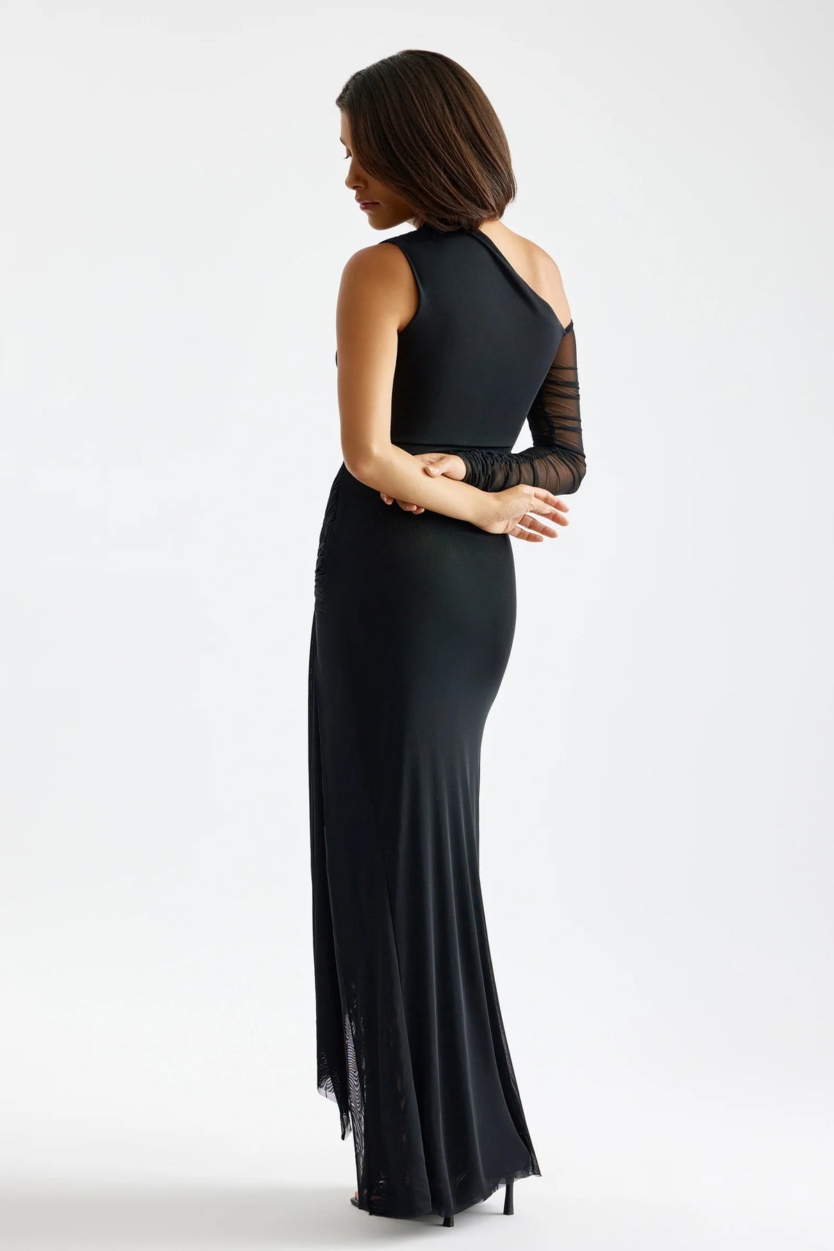The Aurelia Dress is crafted from soft stretch mesh and features an asymmetric one-shoulder neckline with a single sheer sleeve. A gathered loop and sash detail at the stomach flatters the figure, adding shape and movement to the silhouette. Elegant with a modern edge.