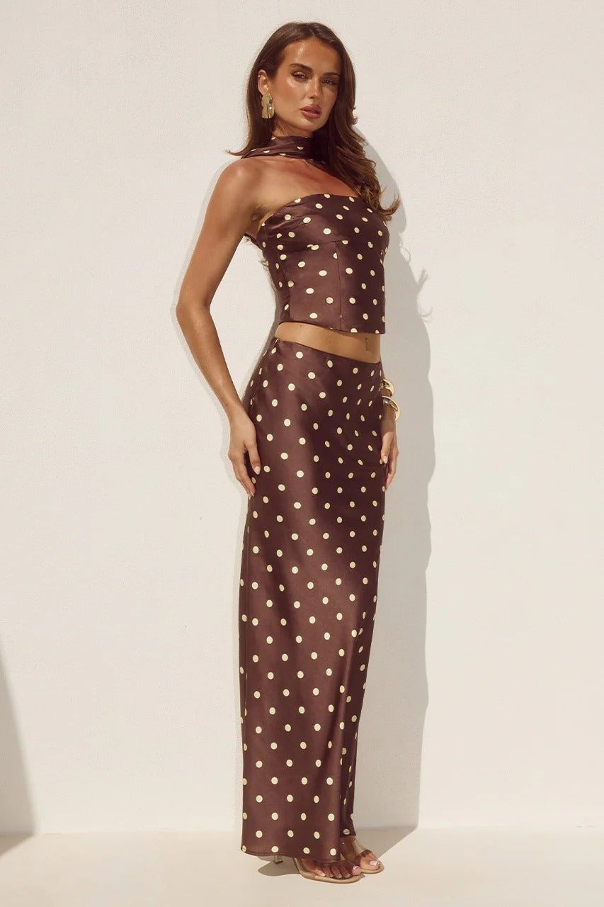 An easy slip on style, our Blaine Maxi Skirt highlights femininity in a classic polka dot print, pair with our Blaine Top to complete the look.