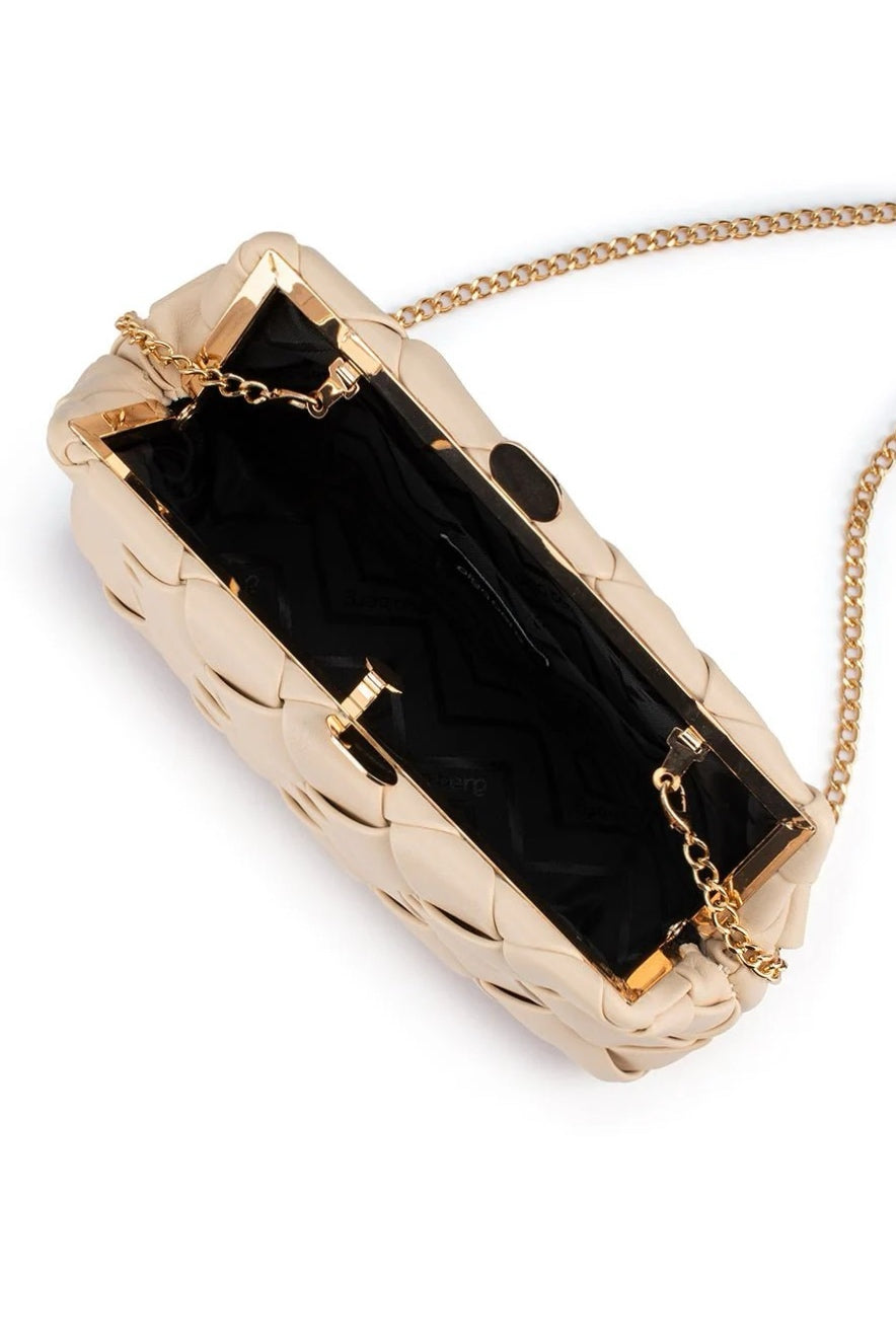 The Quinn Woven Clutch is the perfect accessory to elevate any style. Crafted from premium vegan leather and hand woven, this roomy natural coloured clutch will bring a touch of sophistication to any outfit. Includes a shoulder chain and an additional chain handle that tucks inside or completely detaches when not in use.