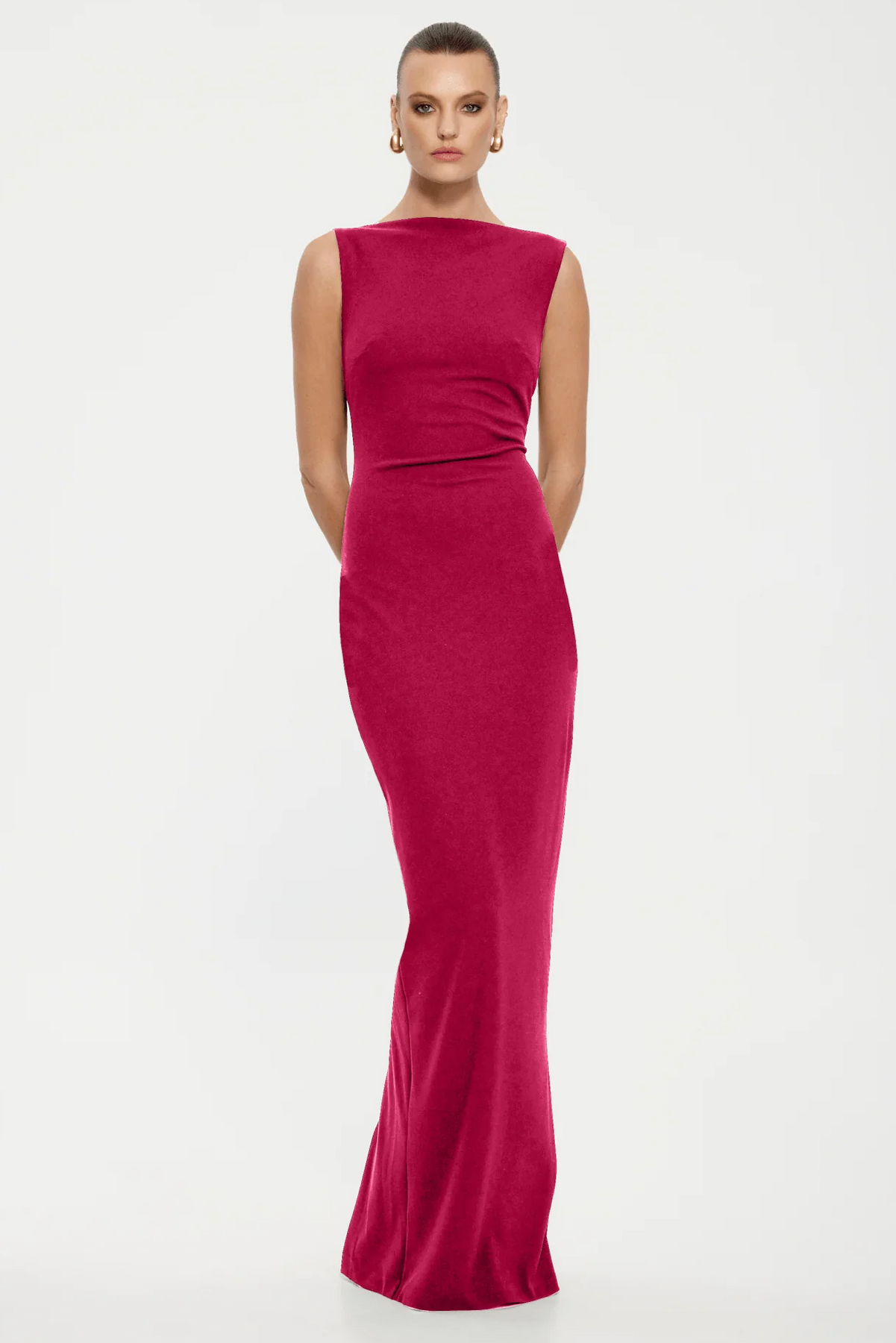Welcoming one our core styles, the Verona Gown. Featuring a beautiful high straight neckline that falls into a low back and cut with a slight split at the back. Crafted from our luxurious stretch crepe that hugs the figure for the most beautiful cinched silhouette.