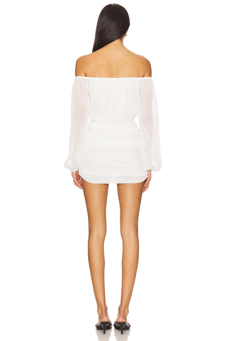 The SNDYS Allena Mini Dress features an off the shoulder neckline, long sleeves and cinched cuffs. It has a hidden side zipper closure and ruched chiffon fabric.