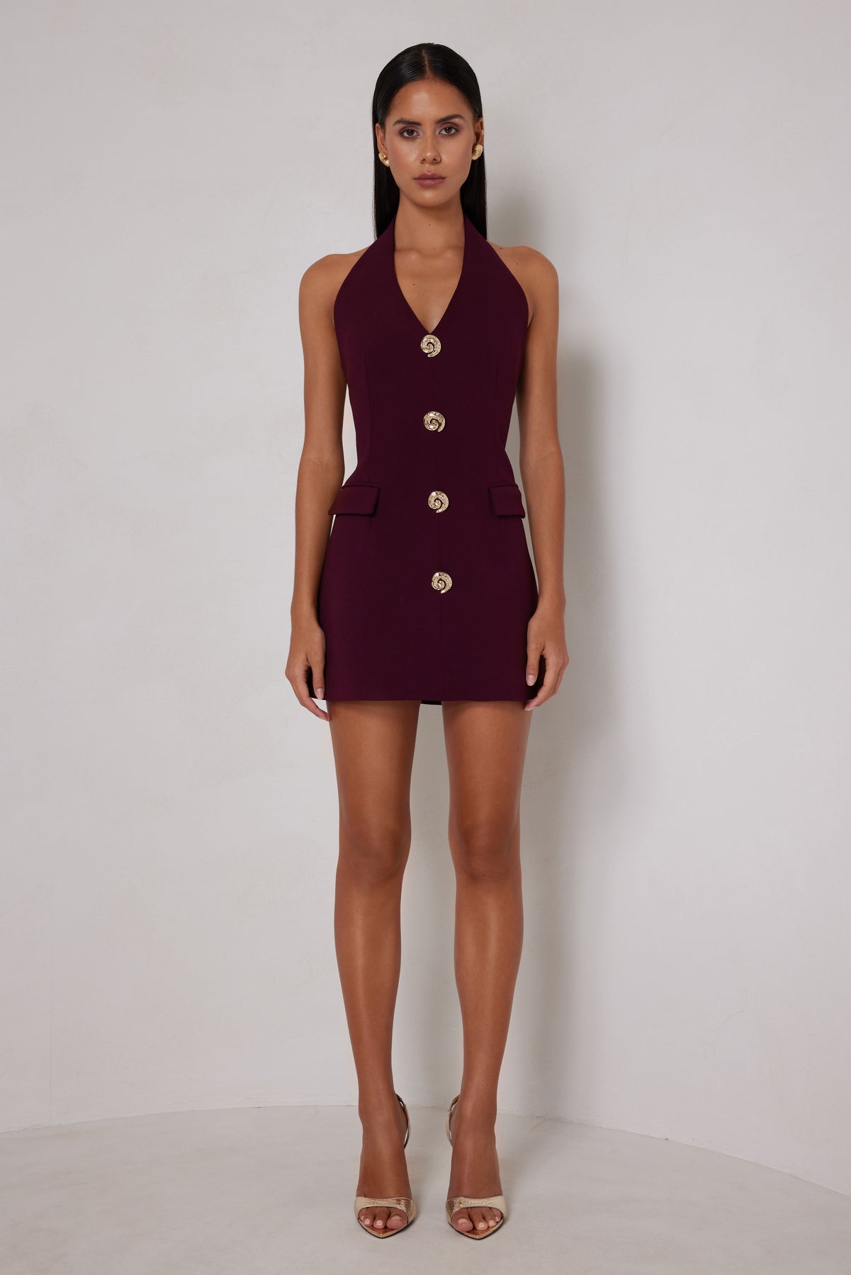 Our Jillian Dress is crafted from thick, stretchy fabric for ultimate comfort and a flattering fit. The chic halter neckline elegantly frames your shoulders, while adorned with eye-catching gold-tone buttons and featuring subtle side pockets, this versatile dress is perfect for any occasion. Also available in White.