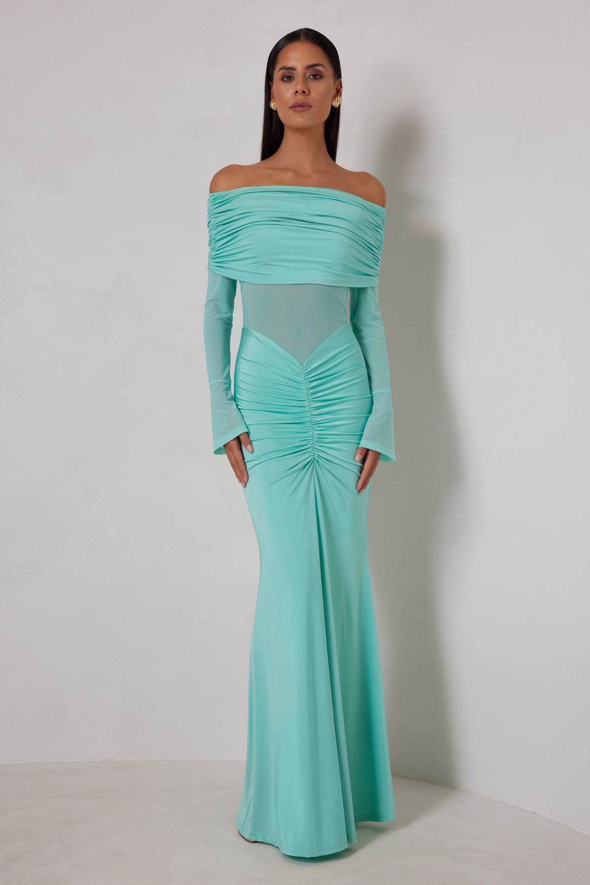 The Paige Dress features a beautiful off-the-shoulder design with gathered detailing and a fitted silhouette. The soft mint colour adds a fresh and elegant touch, while the long sleeves and ruched elements enhance its sophisticated look. Also available in Print & Espresso.