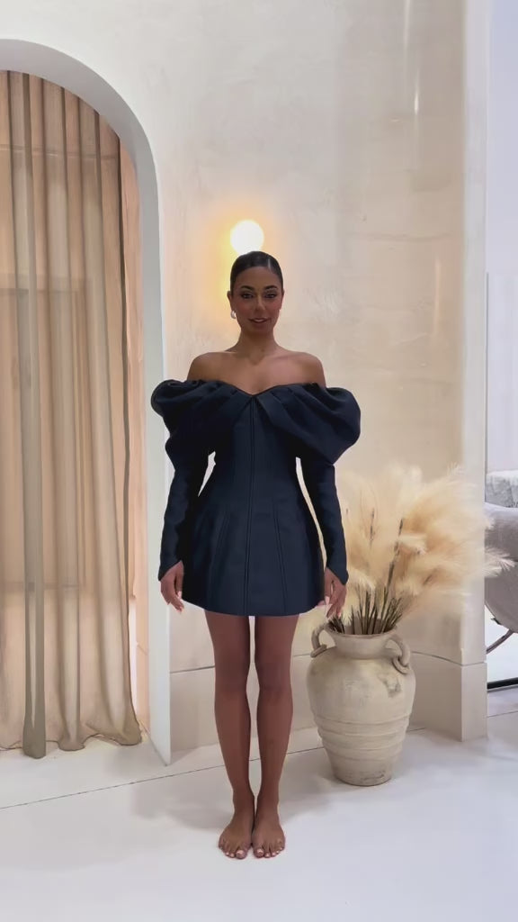 The Nadal Dress is the epitome of modern romance, featuring a stunning off-the-shoulder design that gracefully drapes into long, fitted sleeves, creating a dramatic, sophisticated effect. Boning throughout the dress enhances the structured silhouette, while invisible zippers at the sleeves and centre back ensure ease of wear without compromising style.