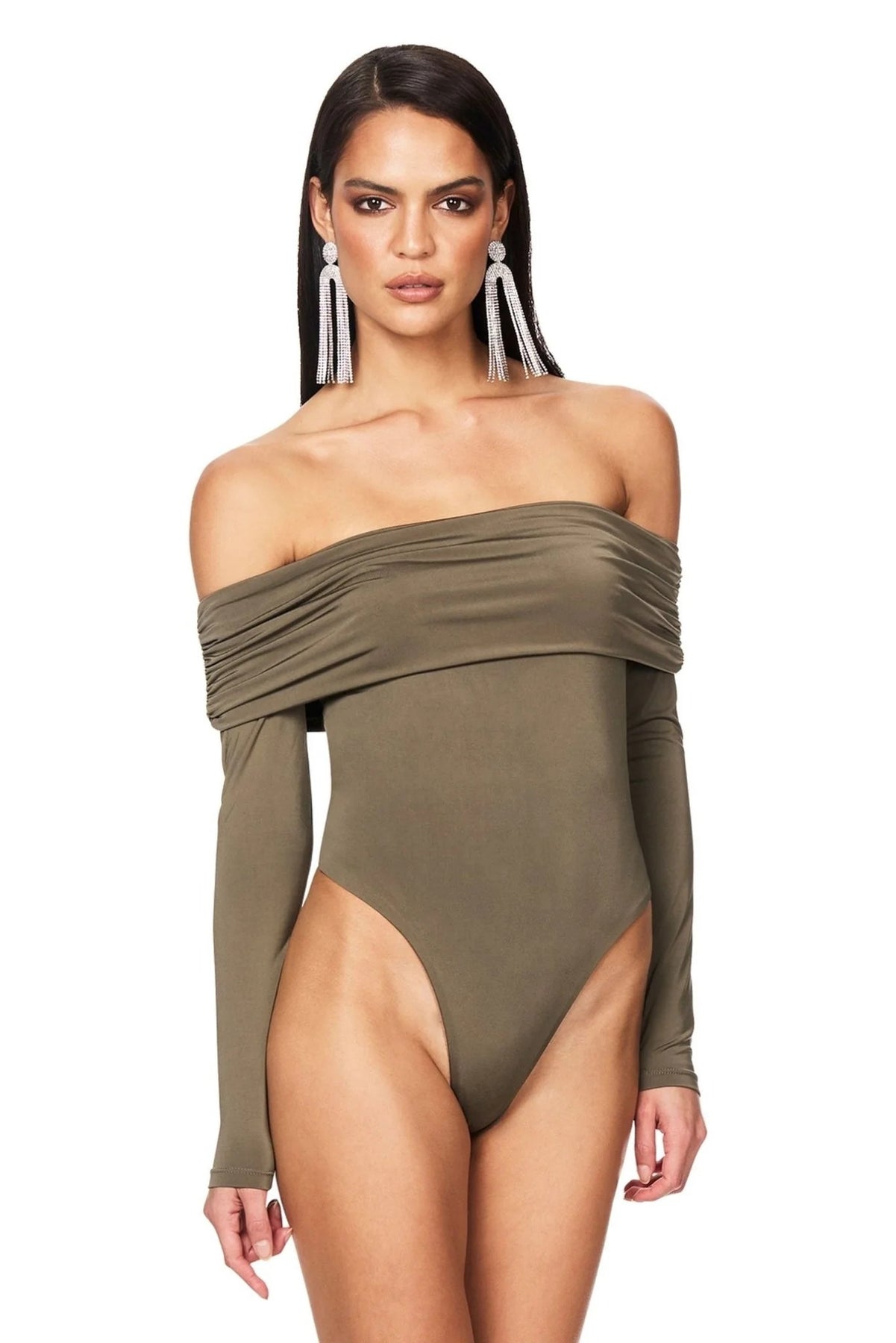 Dress for any occasion with our chic Nookie Element Bodysuit. This bodysuit features a gorgeous off-shoulder fit with long sleeves, and a cheeky cut.