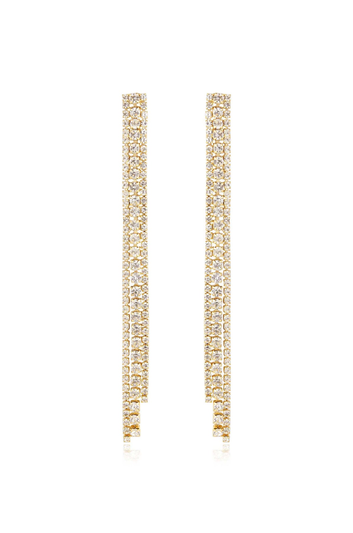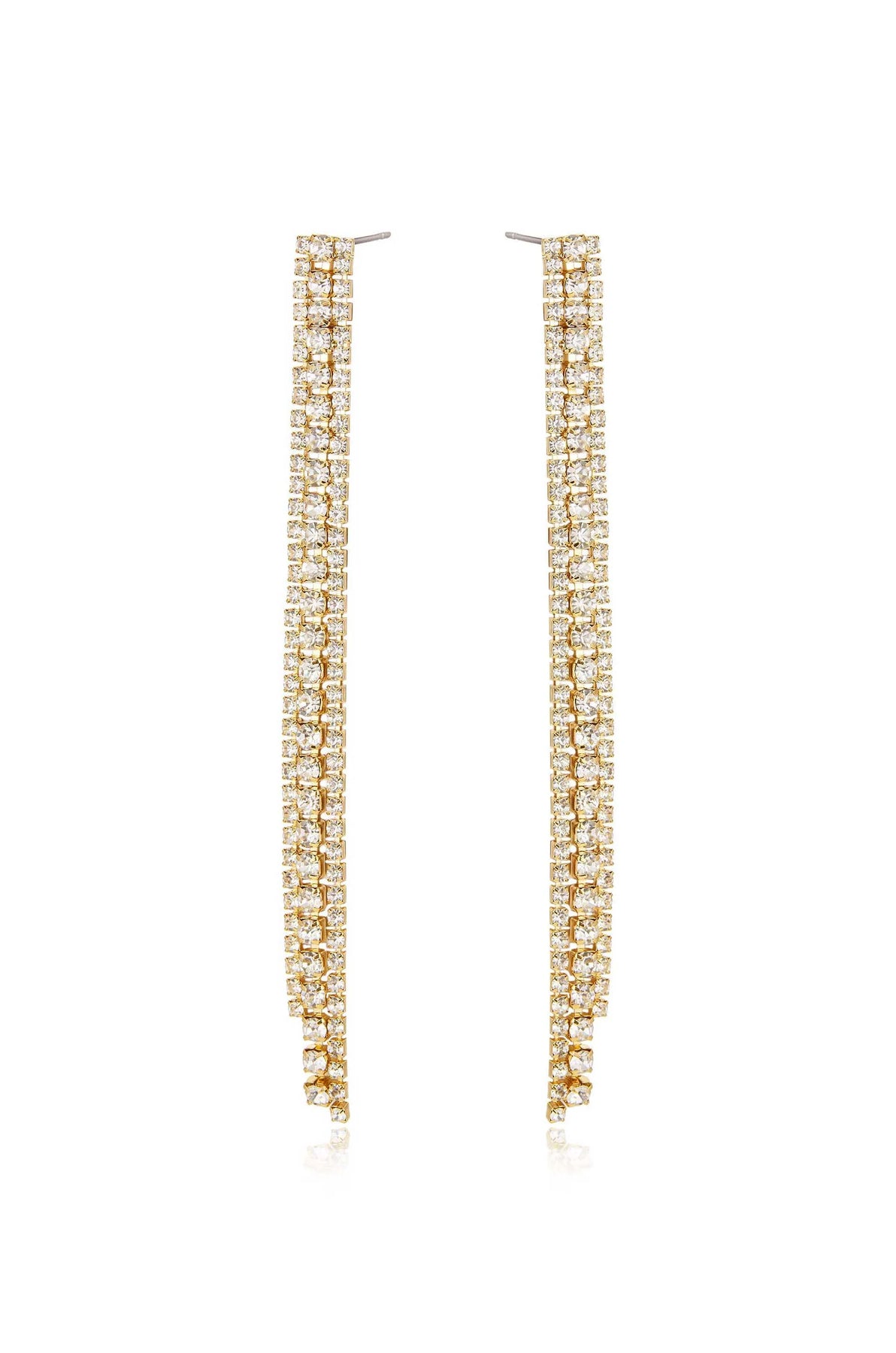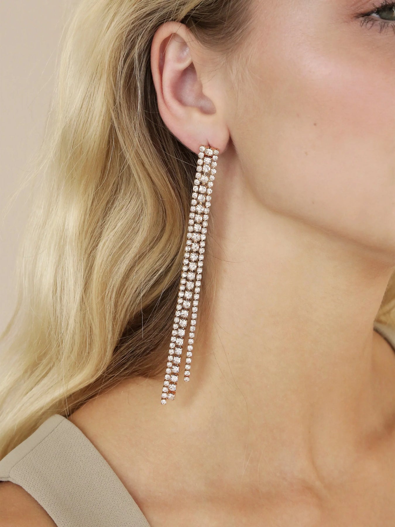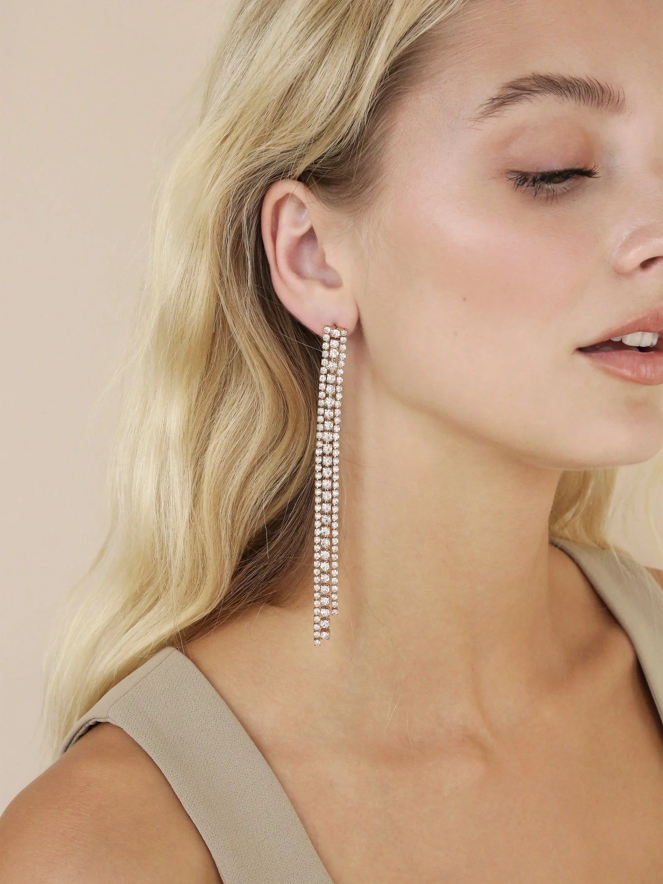 The Your Moment Crystal Dangle Earrings, adorned in 18k gold plating with a stunning 4.8" drop, are cherished for their graceful allure.