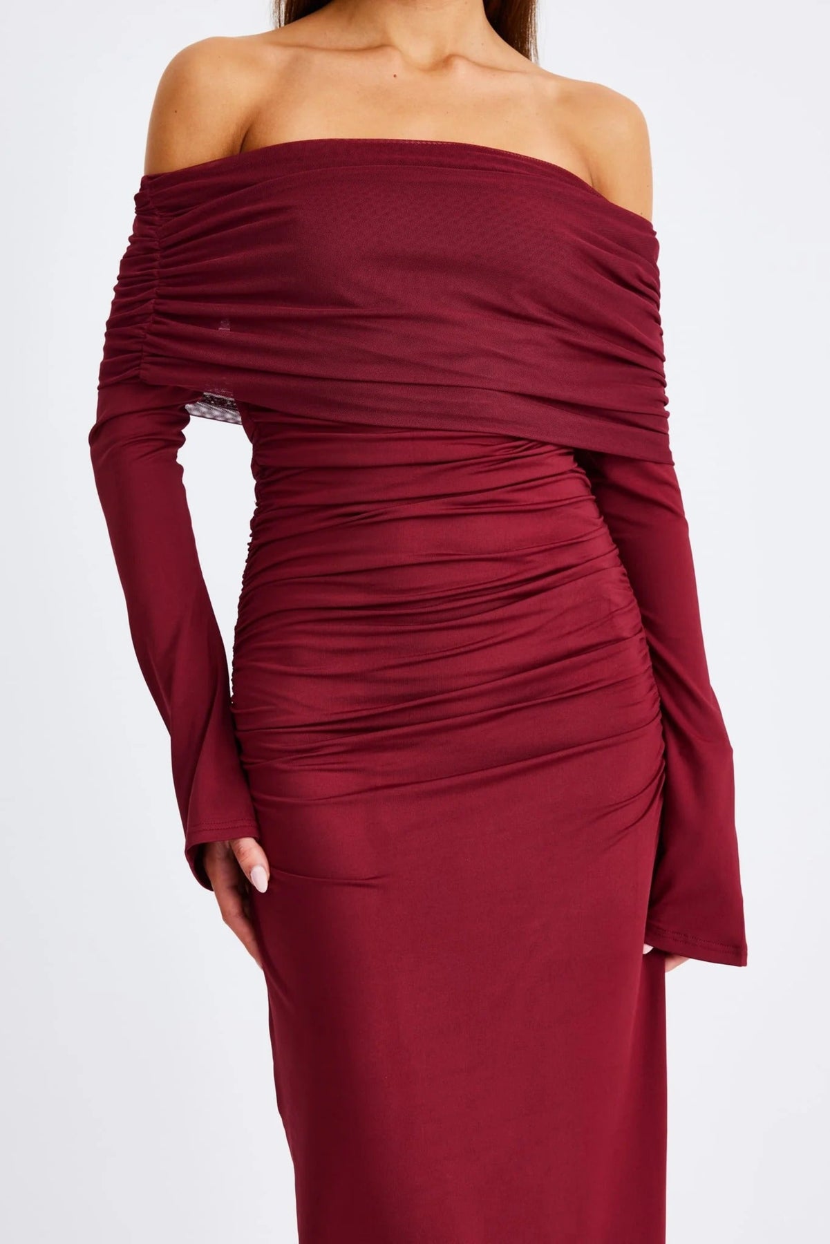 This stunning Stevie Long Sleeve Maxi Dress features a flat, soft matte fabric with just the right amount of stretch for a flattering, comfortable fit. The standout off-shoulder mesh drape detailing adds a touch of romantic drama, while long sleeves with subtly flared cuffs lend a graceful finish. Thoughtful gathering through the waistline creates a beautifully draped silhouette that enhances your natural shape. Fully lined and non-sheer, this dress is designed for both style and confidence.