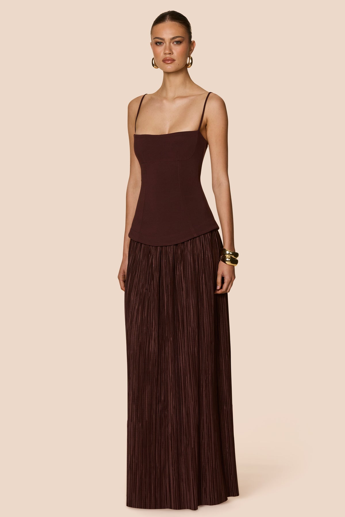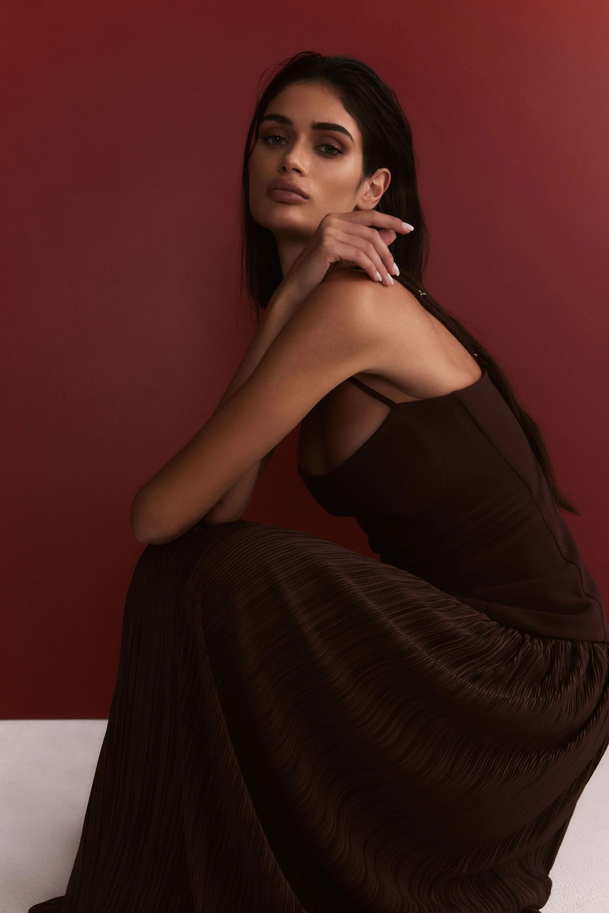 Modern minimalism with a soft twist, the Nookie Darling Maxi Dress is elegantly understated, featuring a sleek bonded crepe, boned bodice, and pleated maxi skirt. With fine adjustable straps, a centre back logo zipper, and an effortless drape, this dress is perfect for sunset soirées and garden weddings.