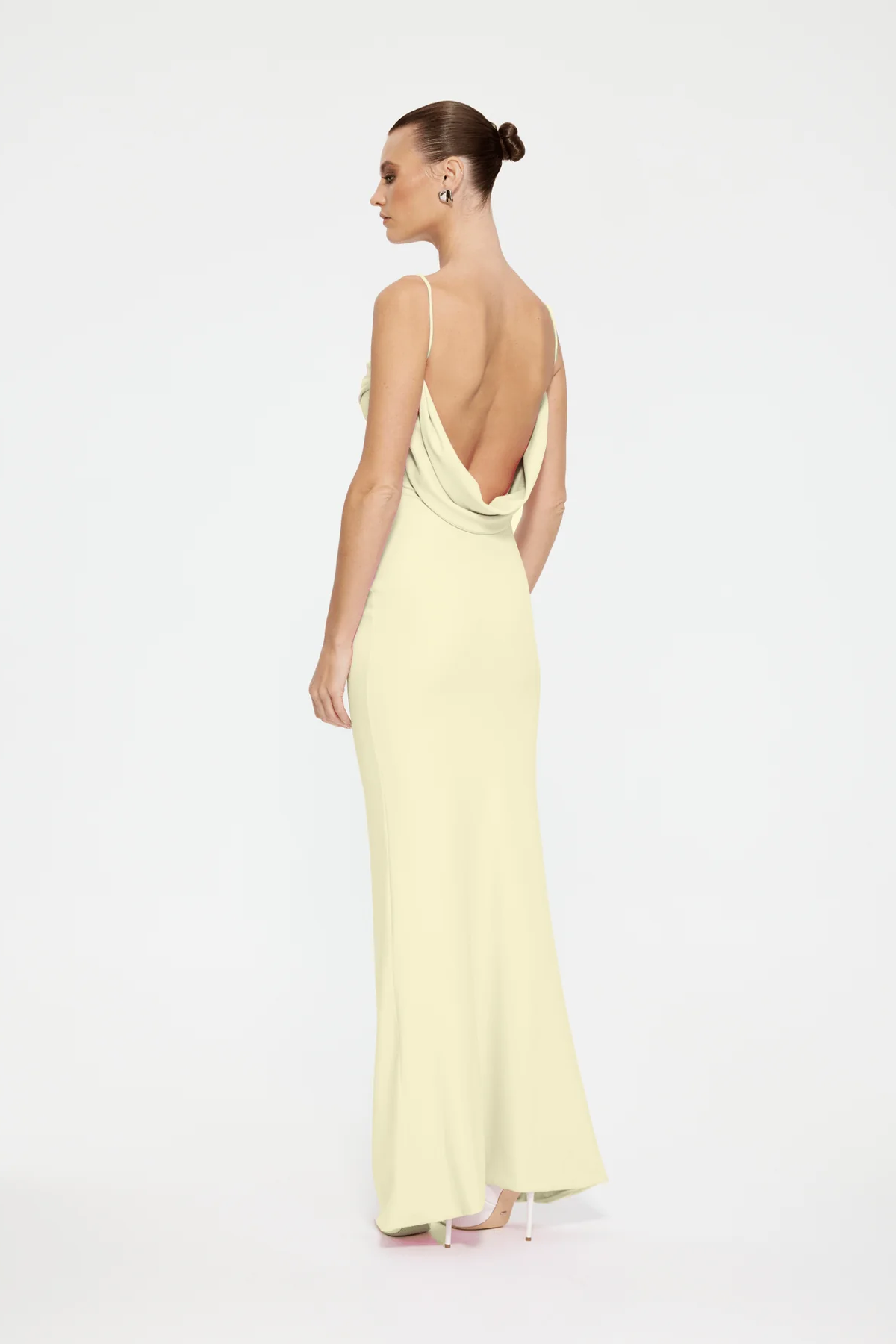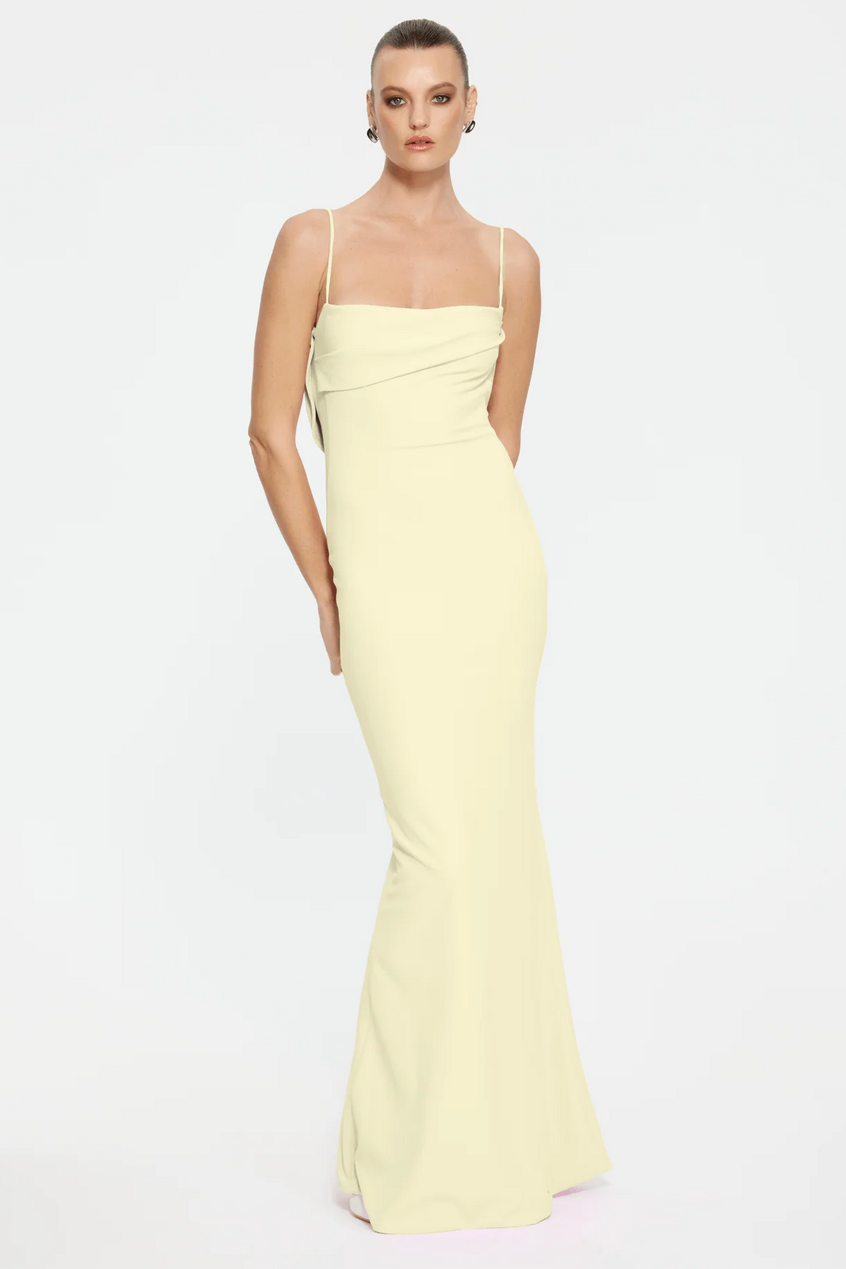 Introducing the Havilland Gown. Designed with a straight neckline and delicate detailing across the bodice for understated elegance. The gown features a deep low back with a special drape for the most flattering silhouette. Made with our signature stretch crepe fabrication for a soft and buttery feel on the body. Our Havilland Gown is fully lined and perfect for all occasions, from evening nights out to your next special event.