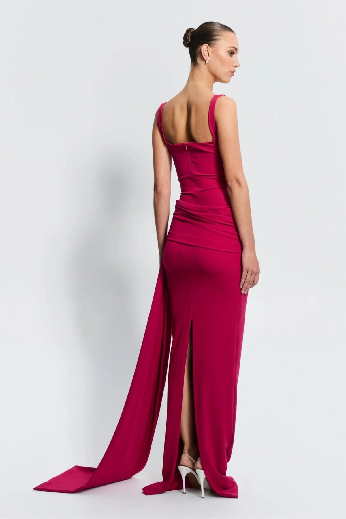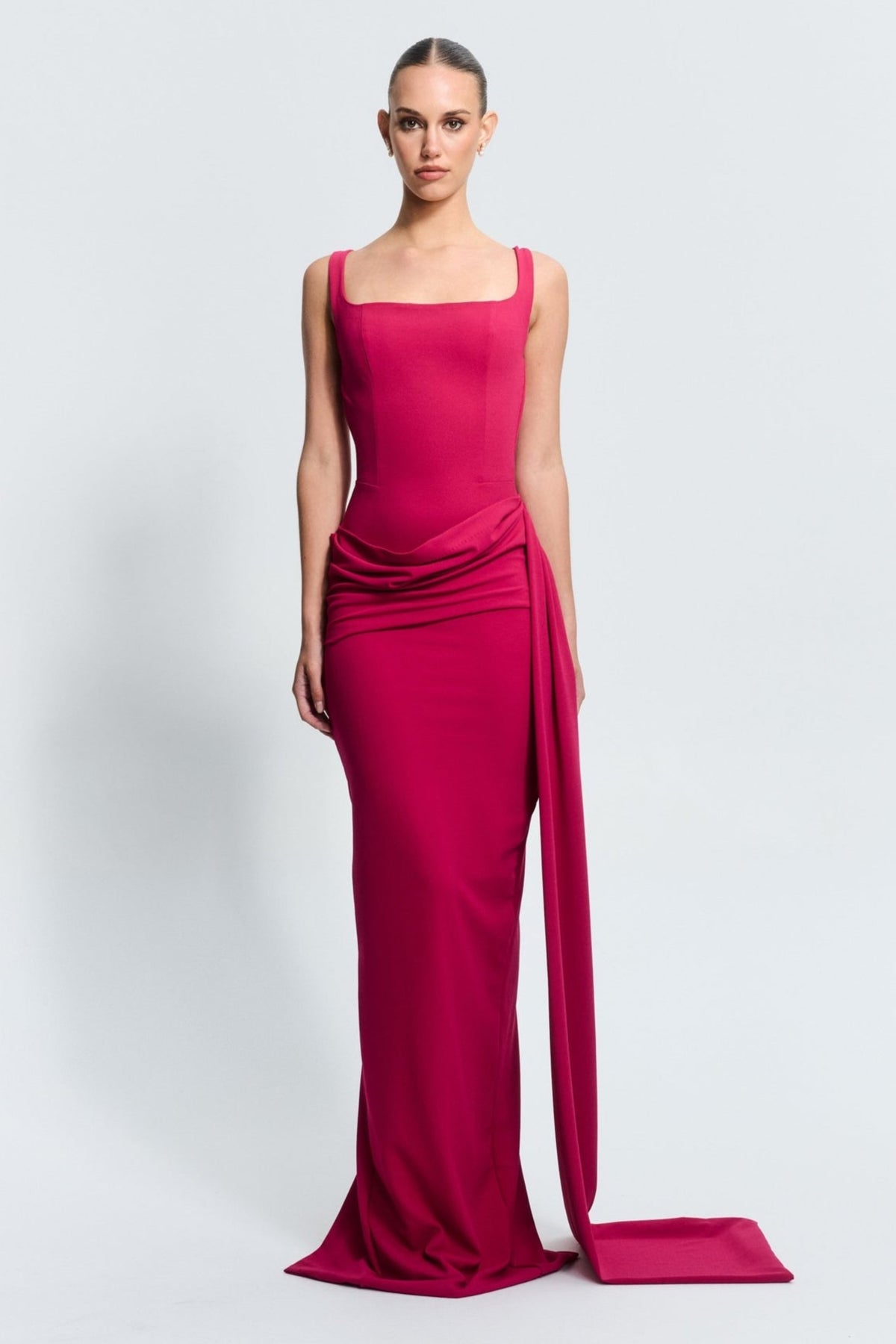 Romantic and tender, the Merle Gown is imagined in both Raspberry and Ivory — shades that speak of softness and strength. Merle features a classic neckline, with delicate ruching across the hips that seamlessly blends into a romantic train.