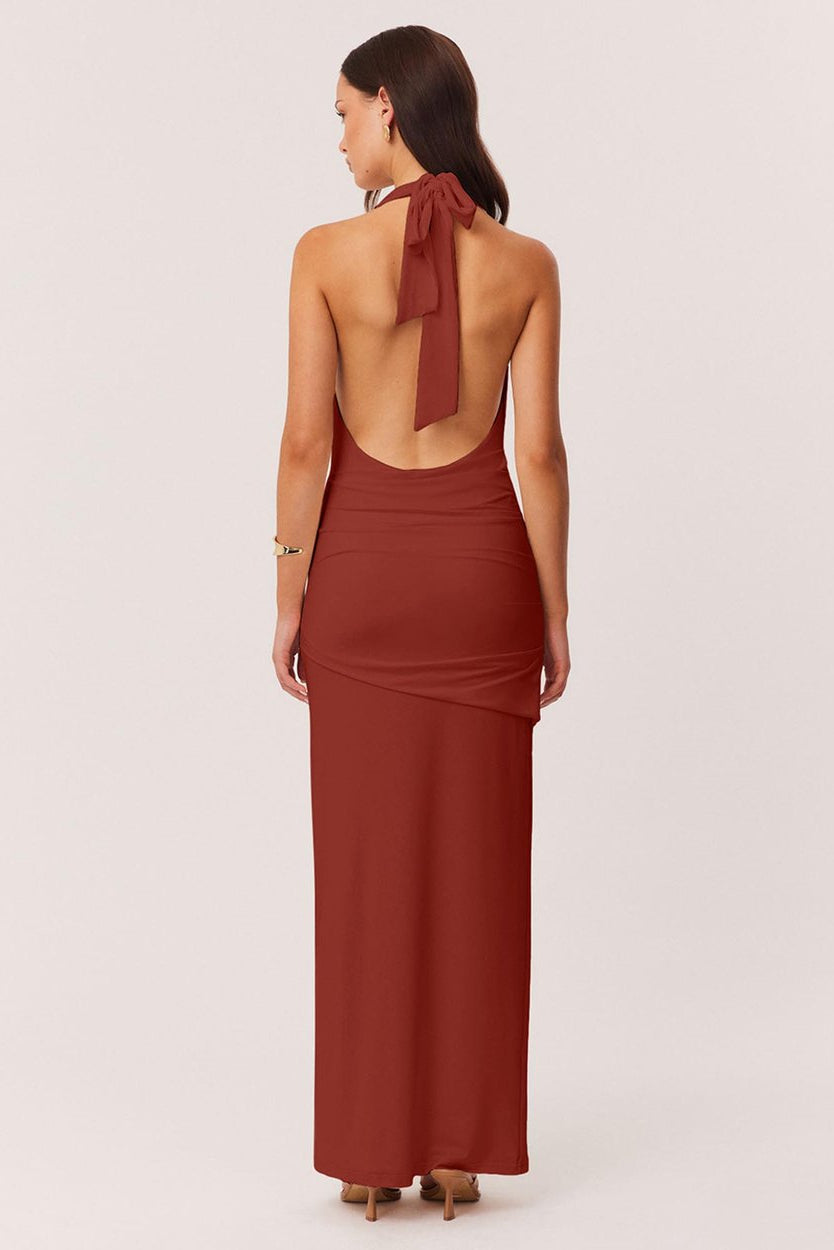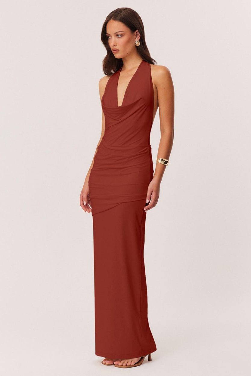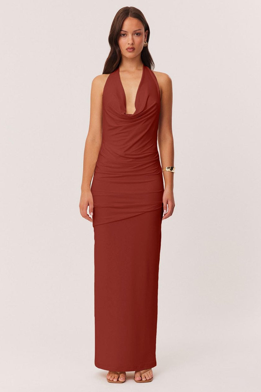The Anita Maxi Dress is a fitted maxi dress that features a cowl neckline and an open self-tie back.