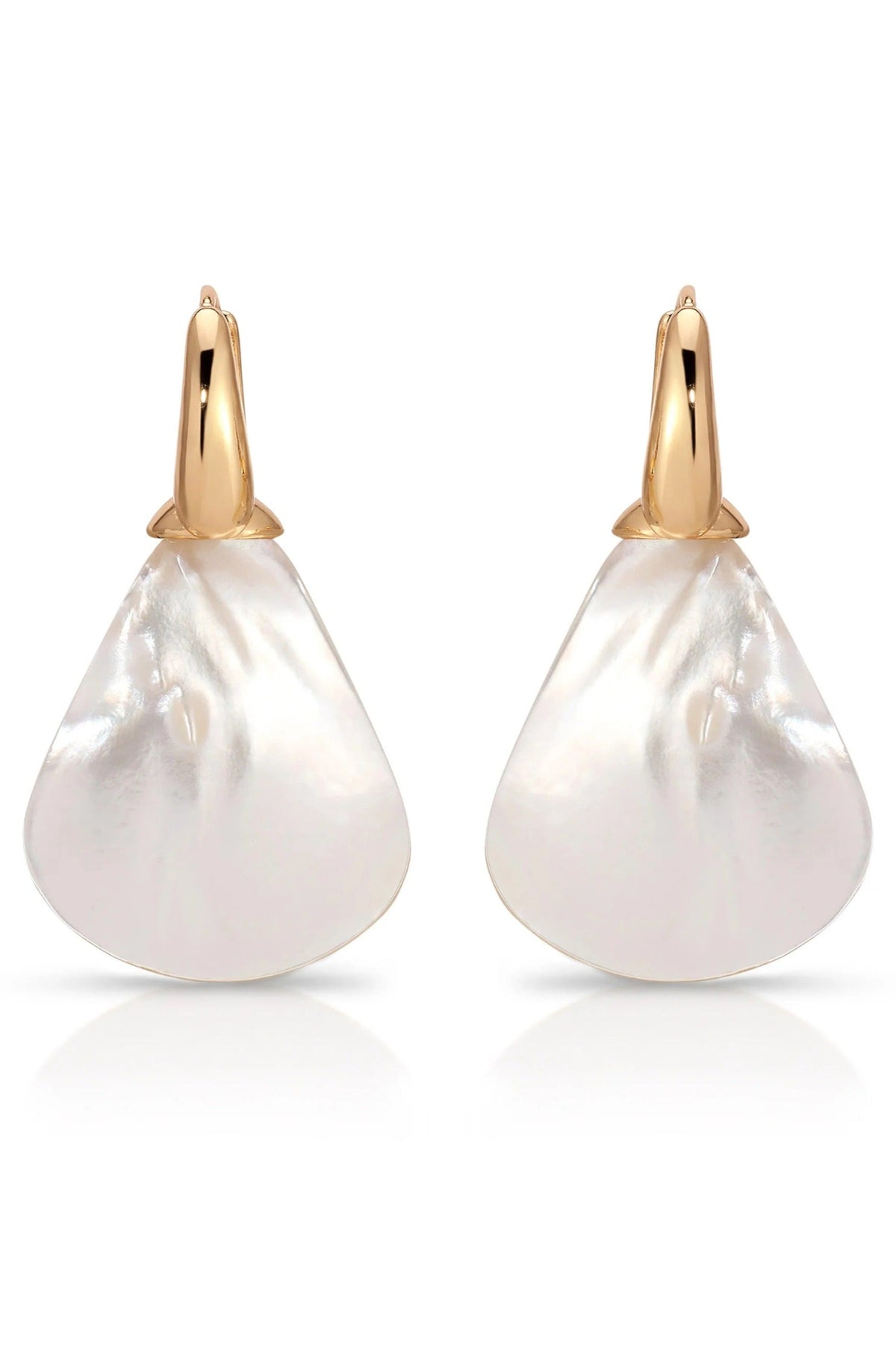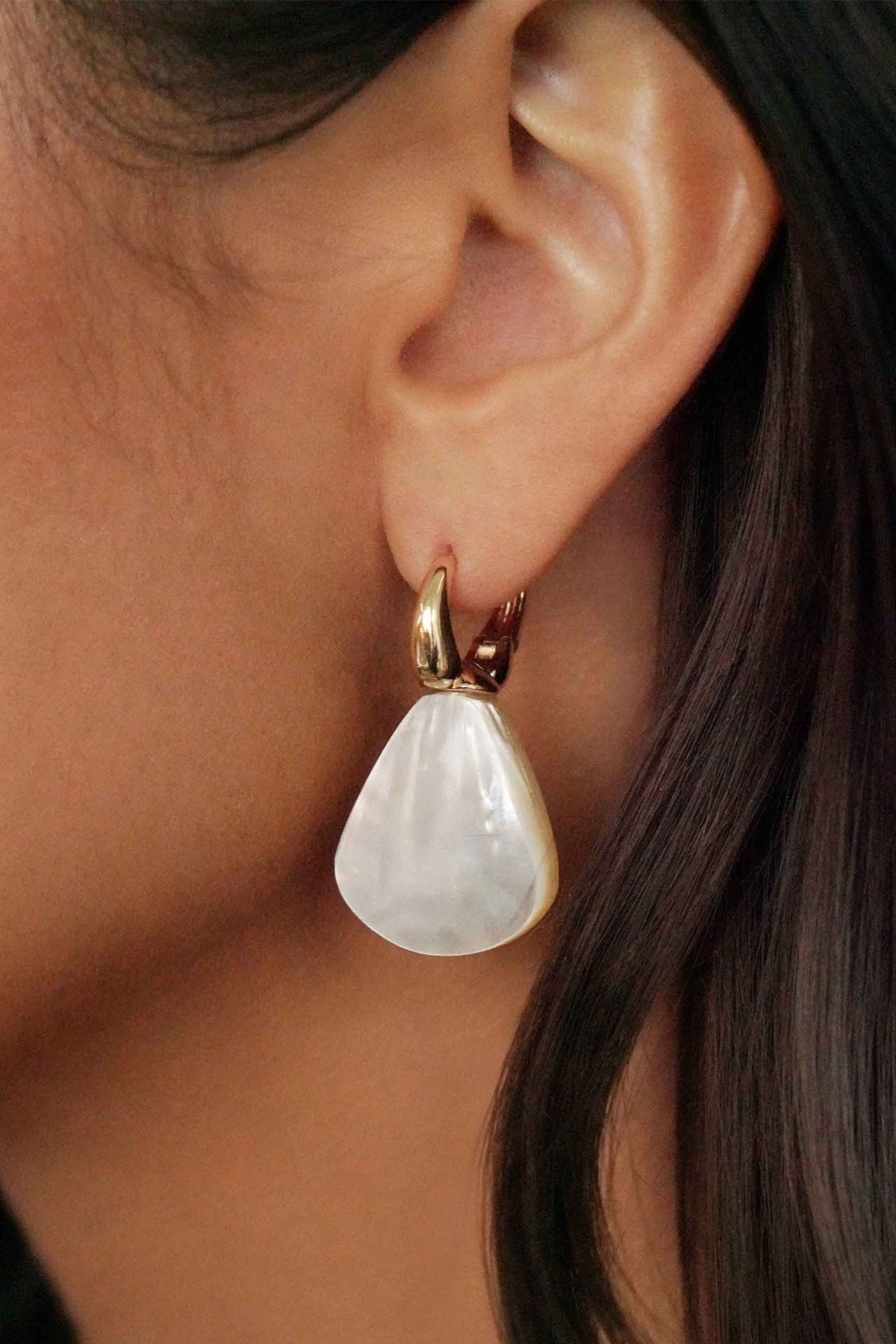 The Sun-Kissed Pearl Earrings feature luminous mother of pearls hanging from an 18k gold plated mini hoop, offering the perfect everyday summer style.